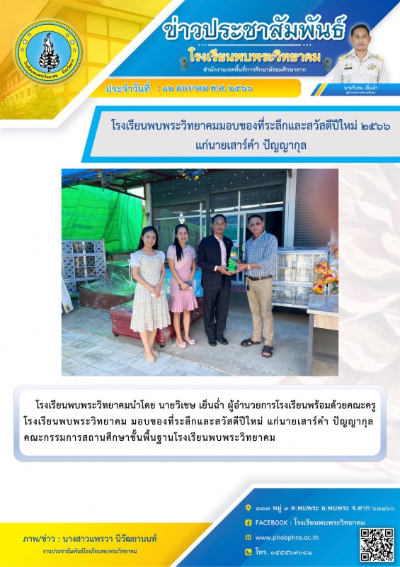 12 ม.ค. 65 โรงเรียนพบพระวิทยาคมมอบของที่ระลึกและสวัสดีปีใหม่ ๒๕๖๖ แก่นายเสาร์คำ ปัญญากุล