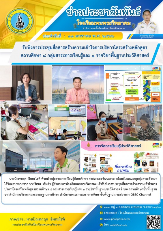 นายปัณฑกฤต อินทะโชติ หัวหน้ากลุ่มสาระการเรียนรู้สังคมศึกษา ศาสนาและวัฒนธรรม พร้อมด้วยคณะครูกลุ่มสาระสังคมฯ ได้รับมอบหมายจาก นายวิเชษ เย็นฉ่ำ ผู้อำนวยการโรงเรียนพบพระวิทยาคม เข้ารับฟังการประชุมสื่อสารสร้างความเข้าใจการบริหารโครงสร้างหลักสูตรสถานศึกษา 8 กลุ่มสาระการเรียนรู้และ 1 รายวิชาพื้นฐานประวัติศาสตร์ ของสถานศึกษาขั้นพื้นฐาน จากสำนักงานวิชาการและมาตรฐานการศึกษา สำนักงานคณะกรรมการการศึกษาขั้นพื้นฐาน ผ่านช่องทาง OBEC Channel |