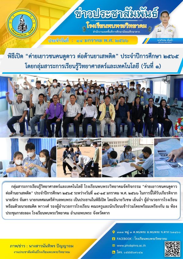 กลุ่มสาระการเรียนรู้วิทยาศาสตร์และเทคโนโลยี โรงเรียนพบพระวิทยาคมจัดกิจกรรม "ค่ายเยาวชนคนดูดาวต่อต้านยาเสพติด" ประจำปีการศึกษา ๒๕๖๖ ระหว่างวันที่ ๑๔ - ๑๕ มกราคม พ.ศ.๒๕๖๖ ในการนี้ได้รับเกียรติจาก นายนิกร จันตา นายกเทศมนตรีตำบลพบพระ เป็นประธานในพิธีเปิด โดยมีนายวิเชษ เย็นฉ่ำ ผู้อำนวยการโรงเรียนพร้อมด้วยนายสมคิด พาวงศ์ รองผู้อำนวยการโรงเรียน คณะครูและนักเรียนเข้าร่วมโดยพร้อมเพรียงกัน ณ ห้องประชุมกาสะลอง โรงเรียนพบพระวิทยาคม อำเภอพบพระ จังหวัดตาก