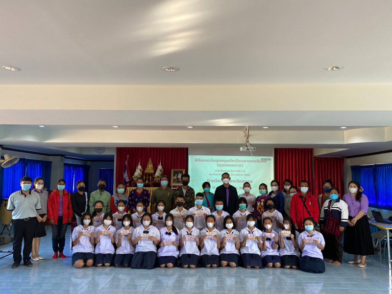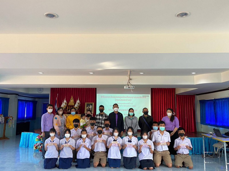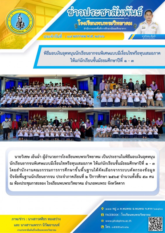 นายวิเชษ เย็นฉ่ำ ผู้อำนวยการโรงเรียนพบพระวิทยาคม เป็นประธานในพิธีมอบเงินอุดหนุน นักเรียนยากจนพิเศษแบบมีเงื่อนไขหรือทุนเสมอภาค ให้แก่นักเรียนชั้นมัธยมศึกษาปีที่ ๑ - ๓ โดยสำนักงานคณะกรรมการการศึกษาขั้นพื้นฐานได้คัดเลือกจากระบบคัดกรองข้อมูลปัจจัยพื้นฐานนักเรียนยากจน ประจำภาคเรียนที่ ๒ ปีการศึกษา ๒๕๖๕ จำนวนทั้งสิ้น ๕๓ คน ณ ห้องประชุมกาสะลอง โรงเรียนพบพระวิทยาคม อำเภอพบพระ จังหวัดตาก |