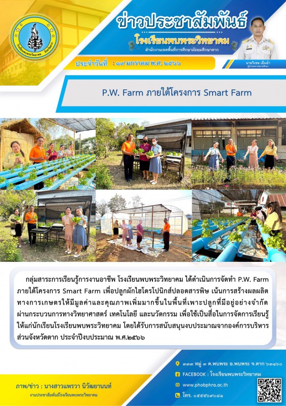 กลุ่มสาระการเรียนรู้การงานอาชีพ โรงเรียนพบพระวิทยาคม ได้ดำเนินการจัดทำ P.W. Farm ภายใต้โครงการ Smart Farm เพื่อปลูกผักไฮโดรโปนิกส์ปลอดสารพิษ เน้นการสร้างผลผลิต ทางการเกษตรให้มีมูลค่าและคุณภาพเพิ่มมากขึ้นในพื้นที่เพาะปลูกที่มีอยู่อย่างจำกัด ผ่านกระบวนการทางวิทยาศาสตร์ เทคโนโลยี และนวัตกรรม เพื่อใช้เป็นสื่อในการจัดการเรียนรู้ให้แก่นักเรียนโรงเรียนพบพระวิทยาคม โดยได้รับการสนับสนุนงบประมาณจากองค์การบริหารส่วนจังหวัดตาก ประจำปีงบประมาณ พ.ศ.๒๕๖๖ |