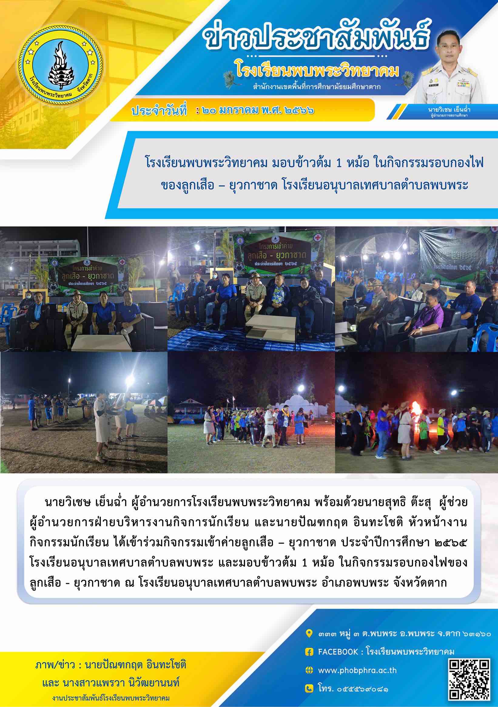 20 ม.ค. 66 รงเรียนพบพระวิทยาคม มอบข้าวต้ม 1 หม้อ ในกิจกรรมรอบกองไฟ ของลูกเสือ – ยุวกาชาด โรงเรียนอนุบาลเทศบาลตำบลพบพระ