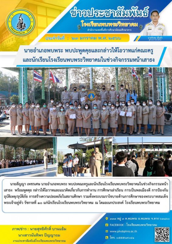 นายสัญญา เพชรเศษ นายอำเภอพบพระ พบปะคณะครูและนักเรียนโรงเรียนพบพระวิทยาคมในช่วงกิจกรรมหน้าเสาธง พร้อมพูดคุย กล่าวให้โอวาทและแนวคิดเกี่ยวกับการทำงาน การศึกษาเล่าเรียน การเป็นพลเมืองดี การป้องกันอุบัติเหตุ/อุบัติภัย การสร้างความปลอดภัยในสถานศึกษา รวมทั้งพระบรมราโชบายด้านการศึกษาของพระบาทสมเด็จพระเจ้าอยู่หัว รัชกาลที่ 10 แก่นักเรียนโรงเรียนพบพระวิทยาคม ณ โดมอเนกประสงค์ โรงเรียนพบพระวิทยาคม |