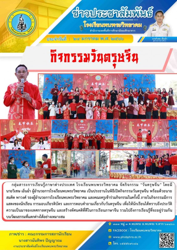 กลุ่มสาระการเรียนรู้ภาษาต่างประเทศ โรงเรียนพบพระวิทยาคม จัดกิจกรรม “วันตรุษจีน” โดยมีนายวิเชษ เย็นฉ่ำ ผู้อำนวยการโรงเรียนพบพระวิทยาคม เป็นประธานในพิธีเปิดกิจกรรมวันตรุษจีน พร้อมด้วยนายสมคิด พาวงศ์ รองผู้อำนวยการโรงเรียนพบพระวิทยาคม และคณะครูเข้าร่วมกิจกรรมในครั้งนี้ ภายในกิจกรรมมีการแสดงของนักเรียน การมอบเกียรติบัตร และการตอบคำถามเกี่ยวกับวันตรุษจีน เพื่อให้นักเรียนได้ทราบถึงประวัติความเป็นมาของเทศกาลตรุษจีน และสร้างทัศนคติที่ดีในการเรียนภาษาจีน รวมไปถึงการเรียนรู้ที่จะอยู่ร่วมกันบนวัฒนธรรมที่แตกต่างได้อย่างเหมาะสม |