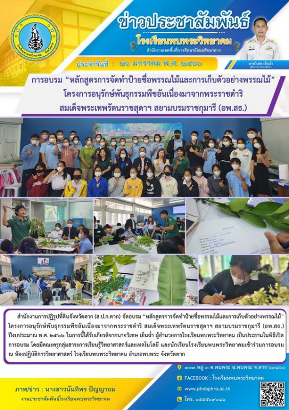 สำนักงานการปฏิรูปที่ดินจังหวัดตาก (ส.ป.ก.ตาก) จัดอบรม “หลักสูตรการจัดทำป้ายชื่อพรรณไม้และการเก็บตัวอย่างพรรณไม้” โครงการอนุรักษ์พันธุกรรมพืชอันเนื่องมาจากพระราชดำริ สมเด็จพระเทพรัตนราชสุดาฯ สยามบรมราชกุมารี (อพ.สธ.) ปีงบประมาณ พ.ศ. 2566 ในการนี้ได้รับเกียรติจากนายวิเชษ เย็นฉ่ำ ผู้อำนวยการโรงเรียนพบพระวิทยาคม เป็นประธานในพิธีเปิดการอบรม โดยมีคณะครูกลุ่มสาระการเรียนรู้วิทยาศาสตร์และเทคโนโลยี และนักเรียนโรงเรียนพบพระวิทยาคมเข้าร่วมการอบรม ณ ห้องปฏิบัติการวิทยาศาสตร์ โรงเรียนพบพระวิทยาคม อำเภอพบพระ จังหวัดตาก |