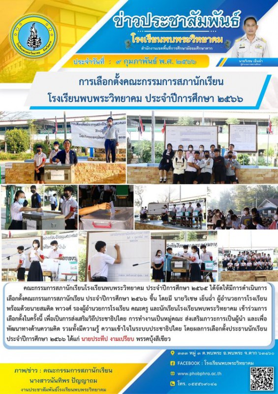 คณะกรรมการสภานักเรียนโรงเรียนพบพระวิทยาคม ประจำปีการศึกษา 2565 ได้จัดให้มีการดำเนินการเลือกตั้งคณะกรรมการสภานักเรียน ประจำปีการศึกษา 2566 ขึ้น โดยมี นายวิเชษ เย็นฉ่ำ ผู้อำนวยการโรงเรียน พร้อมด้วยนายสมคิด พาวงศ์ รองผู้อำนวยการโรงเรียน คณะครู และนักเรียนโรงเรียนพบพระวิทยาคม เข้าร่วมการเลือกตั้งในครั้งนี้ เพื่อเป็นการส่งเสริมวิถีประชาธิปไตย การทำงานเป็นหมู่คณะ ส่งเสริมภาวะการเป็นผู้นำ และเพื่อพัฒนาทางด้านความคิด รวมทั้งมีความรู้ ความเข้าใจในระบบประชาธิปไตย โดยผลการเลือกตั้งประธานนักเรียนประจำปีการศึกษา 2566 ได้แก่ นายประทีป งามเปรียบ พรรคบุ้งสีเขียว |