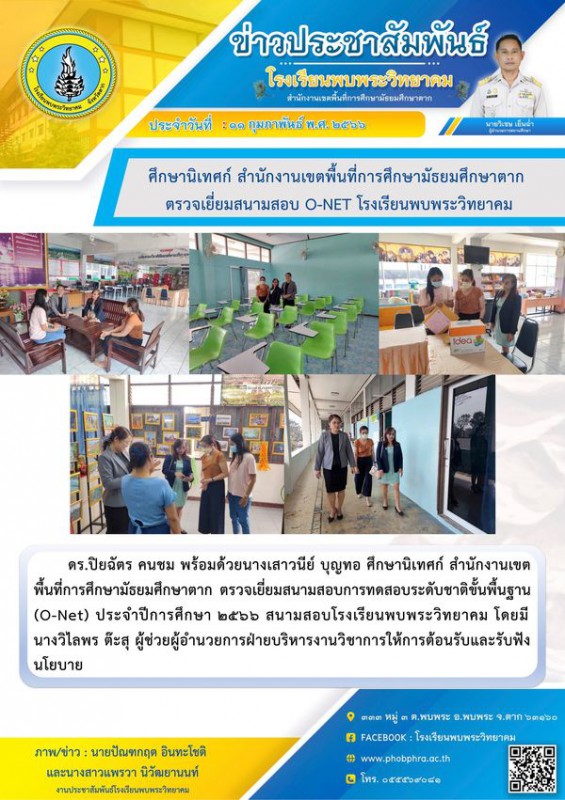 ดร.ปิยฉัตร คนชม พร้อมด้วยนางเสาวนีย์ บุญทอ ศึกษานิเทศก์ สำนักงานเขตพื้นที่การศึกษามัธยมศึกษาตาก ตรวจเยี่ยมสนามสอบการทดสอบระดับชาติขั้นพื้นฐาน (O-NET) ประจำปีการศึกษา ๒๕๖๕ สนามสอบโรงเรียนพบพระวิทยาคม โดยมีนางวิไลพร ต๊ะสุ ผู้ช่วยผู้อำนวยการฝ่ายบริหารงานวิชาการให้การต้อนรับและรับฟังนโยบาย |
