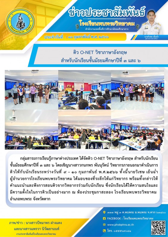 กลุ่มสาระการเรียนรู้ภาษาต่างประเทศ ได้จัดติว O-NET วิชาภาษาอังกฤษ สำหรับนักเรียนชั้นมัธยมศึกษาปีที่ ๓ และ ๖ โดยเชิญนางสาวกนกพร พันนุรัตน์ วิทยากรภายนอกมาดำเนินการติวให้กับนักเรียนระหว่างวันที่ ๙ – ๑๐ กุมภาพันธ์ พ.ศ.๒๕๖๖ ทั้งนี้นายวิเชษ เย็นฉ่ำ ผู้อำนวยการโรงเรียนพบพระวิทยาคม ได้มอบของที่ระลึกให้แก่วิทยากร พร้อมทั้งกล่าวให้คำแนะนำและฟังการสอนติวจากวิทยากรร่วมกับนักเรียน ซึ่งนักเรียนได้ให้ความสนใจและมีความตั้งใจในการติวเป็นอย่างมาก ณ ห้องประชุมกาสะลอง โรงเรียนพบพระวิทยาคม อำเภอพบพระ จังหวัดตาก |