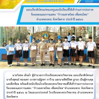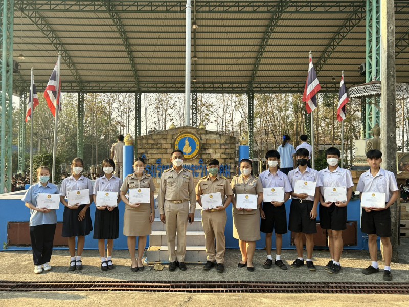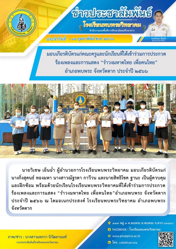 นายวิเชษ เย็นฉ่ำ ผู้อำนวยการโรงเรียนพบพระวิทยาคม มอบเกียรติบัตรแก่ นางกิ่งสุคนธ์ ทองมหา นางสาวณัฐรดา กาวีวน และนายสิทธิโชค ฐานะ เป็นผู้ควบคุมและฝึกซ้อม พร้อมด้วยนักเรียนโรงเรียนพบพระวิทยาคมที่ได้เข้าร่วมการประกวด ร้องเพลงและการแสดง “รำวงมหาดไทย เพื่อคนไทย” อำเภอพบพระ จังหวัดตาก ประจำปี ๒๕๖๖ ณ โดมอเนกประสงค์ โรงเรียนพบพระวิทยาคม อำเภอพบพระ จังหวัดตาก |