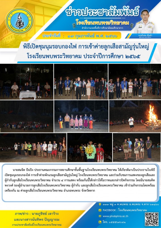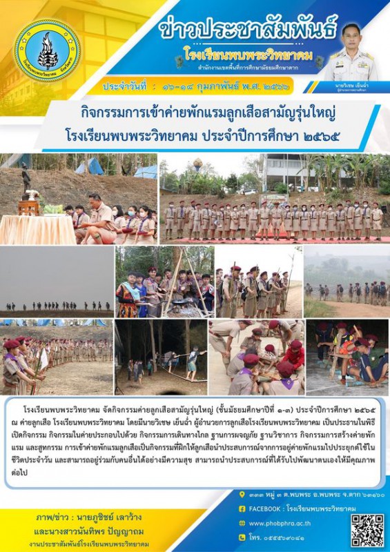 โรงเรียนพบพระวิทยาคม จัดกิจกรรมค่ายลูกเสือสามัญรุ่นใหญ่ (ชั้นมัธยมศึกษาปีที่ ๑-๓) ประจำปีการศึกษา ๒๕๖๕ ณ ค่ายลูกเสือโรงเรียนพบพระวิทยาคม โดยมีนายวิเชษ เย็นฉ่ำ ผู้อำนวยการลูกเสือโรงเรียนพบพระวิทยาคม เป็นประธานในพิธีเปิดกิจกรรม กิจกรรมในค่ายประกอบไปด้วย กิจกรรมการเดินทางไกล ฐานการผจญภัย ฐานวิชาการ กิจกรรมการสร้างค่ายพักแรม และสูทกรรม การเข้าค่ายลูกเสือเป็นกิจกรรมที่ฝึกให้ลูกเสือนำประสบการณ์จากการอยู่ค่ายพักแรมไปประยุกต์ใช้ในชีวิตประจำวัน และสามารถอยู่ร่วมกับคนอื่นได้อย่างมีความสุข สามารถนำประสบการณ์ที่ได้รับไปพัฒนาตนเองให้มีคุณภาพต่อไป |