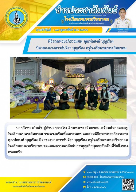 นายวิเชษ เย็นฉ่ำ ผู้อำนวยการโรงเรียนพบพระวิทยาคม พร้อมด้วยคณะครูโรงเรียนพบพระวิทยาคม วางพวงหรีดเพื่อเคารพศพ และร่วมพิธีสวดพระอภิธรรมศพ คุณพ่อสงค์ บุญเรือง บิดาของนางสาวจันจิรา บุญเรือง ครูโรงเรียนพบพระวิทยาคมโรงเรียนพบพระวิทยาคมขอแสดงความอาลัยกับการสูญเสียบุคคลอันเป็นที่รักยิ่งของครอบครัว |
