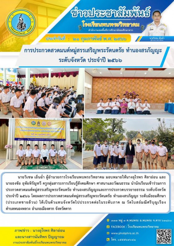 นายวิเชษ เย็นฉ่ำ ผู้อำนวยการโรงเรียนพบพระวิทยาคม มอบหมายให้นางอุไรพร ศิลาอ่อน และนายธงชัย อุทัยหิรัญทวี ครูกลุ่มสาระการเรียนรู้สังคมศึกษา ศาสนาและวัฒนธรรม นำนักเรียนเข้าร่วมการประกวดสวดมนต์หมู่สรรเสริญพระรัตนตรัย ทำนองสรภัญญะและการประกวดบรรยายธรรม ระดับจังหวัดประจำปี 2566 โดยผลการประกวดสวดมนต์หมู่สรรเสริญพระรัตนตรัย ทำนองสรภัญญะ ระดับมัธยมศึกษา (ประเภทชายล้วน) ได้เป็นตัวแทนจังหวัดไปประกวดต่อในระดับภาค ณ วัดโบสถ์มณีศรีบุญเรือง ตำบลหนองหลวง อำเภอเมืองตาก จังหวัดตาก |