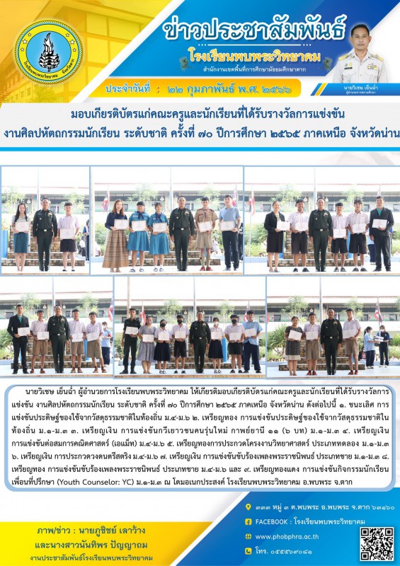นายวิเชษ เย็นฉ่ำ ผู้อำนวยการโรงเรียนพบพระวิทยาคม ให้เกียรติมอบเกียรติบัตรแก่คณะครูและนักเรียนที่ได้รับรางวัลการแข่งขัน งานศิลปหัตถกรรมนักเรียน ระดับชาติ ครั้งที่ 70 ปีการศึกษา 2565 ภาคเหนือ จังหวัดน่าน ดังต่อไปนี้ 1. ชนะเลิศ การแข่งขันประดิษฐ์ของใช้จากวัสดุธรรมชาติในท้องถิ่น ม.4-ม.6 2. เหรียญทอง การแข่งขันประดิษฐ์ของใช้จากวัสดุธรรมชาติในท้องถิ่น ม.1-ม.3 3. เหรียญเงิน การแข่งขันกวีเยาวชนคนรุ่นใหม่ กาพย์ยานี ๑๑ (๖ บท) ม.1-ม.3 4. เหรียญเงิน การแข่งขันต่อสมการคณิตศาสตร์ (เอแม็ท) ม.4-ม.6 5. เหรียญทองการประกวดโครงงานวิทยาศาสตร์ ประเภททดลอง ม.1-ม.3 6. เหรียญเงิน การประกวดวงดนตรีสตริง ม.4-ม.6 7. เหรียญเงิน การแข่งขันขับร้องเพลงพระราชนิพนธ์ ประเภทชาย ม.1-ม.3 8. เหรียญทอง การแข่งขันขับร้องเพลงพระราชนิพนธ์ ประเภทชาย ม.4-ม.6 และ 9. เหรียญทองแดง การแข่งขันกิจกรรมนักเรียนเพื่อนที่ปรึกษา (Youth Counselor: YC) ม.1-ม.3 ณ โดมอเนกประสงค์ โรงเรียนพบพระวิทยาคม อ.พบพระ จ.ตาก |
