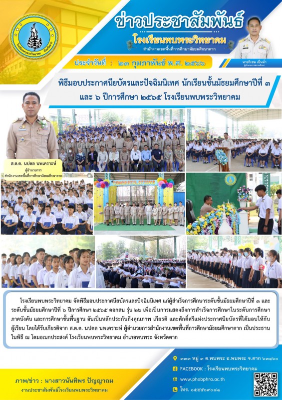 โรงเรียนพบพระวิทยาคม จัดพิธีมอบประกาศนียบัตรและปัจฉิมนิเทศ แก่ผู้สำเร็จการศึกษาระดับชั้นมัธยมศึกษาปีที่ 3 และระดับชั้นมัธยมศึกษาปีที่ 6 ปีการศึกษา 2565 ดอกสน รุ่น 26 เพื่อเป็นการแสดงถึงการสำเร็จการศึกษาในระดับการศึกษาภาคบังคับ และการศึกษาขั้นพื้นฐาน อันเป็นหลักประกันถึงคุณภาพ เกียรติ และศักดิ์ศรีแห่งประกาศนียบัตรที่ได้มอบให้กับผู้เรียน โดยได้รับเกียรติจาก ส.ต.ต. นปดล นพเคราะห์ ผู้อำนวยการสำนักงานเขตพื้นที่การศึกษามัธยมศึกษาตาก เป็นประธานในพิธี ณ โดมอเนกประสงค์ โรงเรียนพบพระวิทยาคม อำเภอพบพระ จังหวัดตาก |