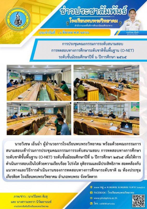 นายวิเชษ เย็นฉ่ำ ผู้อำนวยการโรงเรียนพบพระวิทยาคม พร้อมด้วยคณะกรรมการสนามสอบเข้าร่วมการประชุมคณะกรรมการระดับสนามสอบ การทดสอบทางการศึกษาระดับชาติขั้นพื้นฐาน (O-NET) ระดับชั้นมัธยมศึกษาปีที่ ๖ ปีการศึกษา ๒๕๖๕ เพื่อให้การดำเนินการสอบเป็นไปด้วยความเรียบร้อย โปร่งใส ยุติธรรมและมีประสิทธิภาพ สอดคล้องกับแนวทางและวิธีการดำเนินงานของการทดสอบทางการศึกษาระดับชาติ ณ ห้องประชุมเกียรติยศ โรงเรียนพบพระวิทยาคม อำเภอพบพระ จังหวัดตาก |