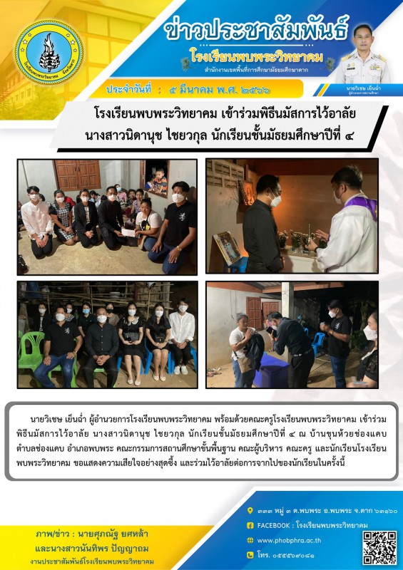 นายวิเชษ เย็นฉ่ำ ผู้อำนวยการโรงเรียนพบพระวิทยาคม พร้อมด้วยคณะครูโรงเรียนพบพระวิทยาคม เข้าร่วมพิธีนมัสการไว้อาลัย นางสาวนิดานุช ไชยวกุล นักเรียนชั้นมัธยมศึกษาปีที่ 4 ณ บ้านขุนห้วยช่องแคบ ตำบลช่องแคบ อำเภอพบพระ คณะกรรมการสถานศึกษาขั้นพื้นฐาน คณะผู้บริหาร คณะครู และนักเรียนโรงเรียนพบพระวิทยาคม ขอแสดงความเสียใจอย่างสุดซึ้ง และร่วมไว้อาลัยต่อการจากไปของนักเรียนในครั้งนี้ |