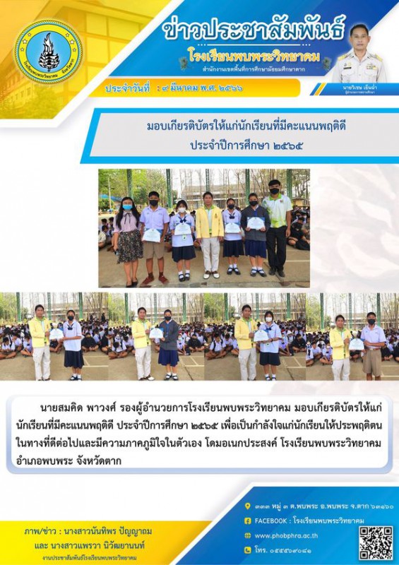 นายสมคิด พาวงศ์ รองผู้อำนวยการโรงเรียนพบพระวิทยาคม มอบเกียรติบัตรให้แก่นักเรียนที่มีคะแนนพฤติดี ประจำปีการศึกษา ๒๕๖๕ เพื่อเป็นกำลังใจแก่นักเรียนให้ประพฤติตนในทางที่ดีต่อไปและมีความภาคภูมิใจในตัวเอง โดมอเนกประสงค์ โรงเรียนพบพระวิทยาคม อำเภอพบพระ จังหวัดตาก |