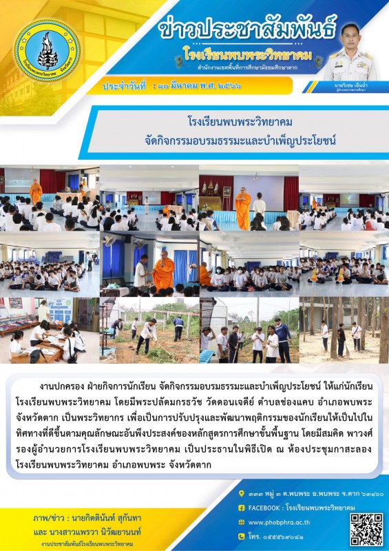 งานปกครอง ฝ่ายกิจการนักเรียน จัดกิจกรรมอบรมธรรมะและบำเพ็ญประโยชน์ ให้แก่นักเรียนโรงเรียนพบพระวิทยาคม โดยมีพระปลัดมกรธวัช วัดดอนเจดีย์ ตำบลช่องแคบ อำเภอพบพระ จังหวัดตาก เป็นพระวิทยากร เพื่อเป็นการปรับปรุงและพัฒนาพฤติกรรมของนักเรียนให้เป็นไปในทิศทางที่ดีขึ้นตามคุณลักษณะอันพึงประสงค์ของหลักสูตรการศึกษาขั้นพื้นฐาน โดยมีสมคิด พาวงศ์ รองผู้อำนวยการโรงเรียนพบพระวิทยาคม เป็นประธานในพิธีเปิด ณ ห้องประชุมกาสะลอง โรงเรียนพบพระวิทยาคม อำเภอพบพระ จังหวัดตาก |