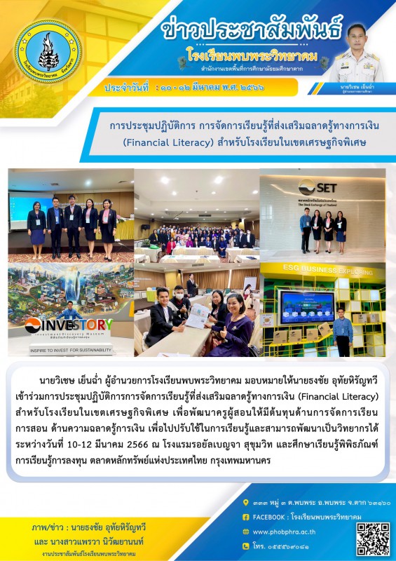 นายวิเชษ เย็นฉ่ำ ผู้อำนวยการโรงเรียนพบพระวิทยาคม มอบหมายให้นายธงชัย อุทัยหิรัญทวี เข้าร่วมการประชุมปฏิบัติการการจัดการเรียนรู้ที่ส่งเสริมฉลาดรู้ทางการเงิน (Financial Literacy) สำหรับโรงเรียนในเขตเศรษฐกิจพิเศษ เพื่อพัฒนาครูผู้สอนให้มีต้นทุนด้านการจัดการเรียน การสอน ด้านความฉลาดรู้การเงิน เพื่อไปปรับใช้ในการเรียนรู้และสามารถพัฒนาเป็นวิทยากรได้ ระหว่างวันที่ 10-12 มีนาคม 2566 ณ โรงแรมรอยัลเบญจา สุขุมวิท และศึกษาเรียนรู้พิพิธภัณฑ์ การเรียนรู้การลงทุน ตลาดหลักทรัพย์แห่งประเทศไทย กรุงเทพมหานคร |
