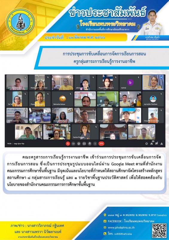คณะครูสาระการเรียนรู้การงานอาชีพ เข้าร่วมการประชุมการขับเคลื่อนการจัดการเรียนการสอน ซึ่งเป็นการประชุมรูปแบบออนไลน์ผ่าน Google Meet ตามที่สำนักงานคณะกรรมการศึกษาขั้นพื้นฐาน มีจุดเน้นและนโยบายที่กำหนดให้สถานศึกษาจัดโครงสร้างหลักสูตรสถานศึกษา ๘ กลุ่มสาระการเรียนรู้ และ ๑ รายวิชาพื้นฐานประวัติศาสตร์ เพื่อให้สอดคล้องกับนโยบายของสำนักงานคณะกรรมการการศึกษาขั้นพื้นฐาน |