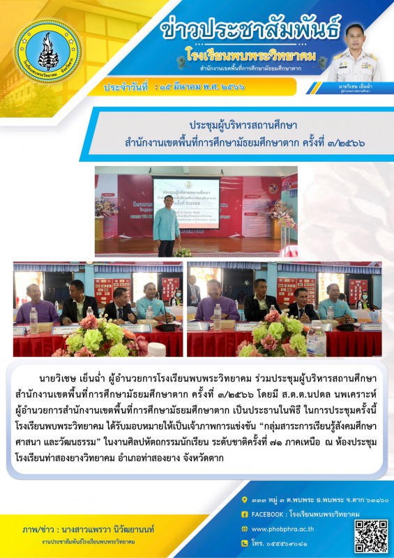นายวิเชษ เย็นฉ่ำ ผู้อำนวยการโรงเรียนพบพระวิทยาคม ร่วมประชุมผู้บริหารสถานศึกษา สำนักงานเขตพื้นที่การศึกษามัธยมศึกษาตาก ครั้งที่ ๓/๒๕๖๖ โดยมี ส.ต.ต.นปดล นพเคราะห์ ผู้อำนวยการสำนักงานเขตพื้นที่การศึกษามัธยมศึกษาตาก เป็นประธานในพิธี ในการประชุมครั้งนี้โรงเรียนพบพระวิทยาคม ได้รับมอบหมายให้เป็นเจ้าภาพการแข่งขัน “กลุ่มสาระการเรียนรู้สังคมศึกษา ศาสนา และวัฒนธรรม” ในงานศิลปหัตถกรรมนักเรียน ระดับชาติครั้งที่ ๗๑ ภาคเหนือ ณ ห้องประชุมโรงเรียนท่าสองยางวิทยาคม อำเภอท่าสองยาง จังหวัดตาก |