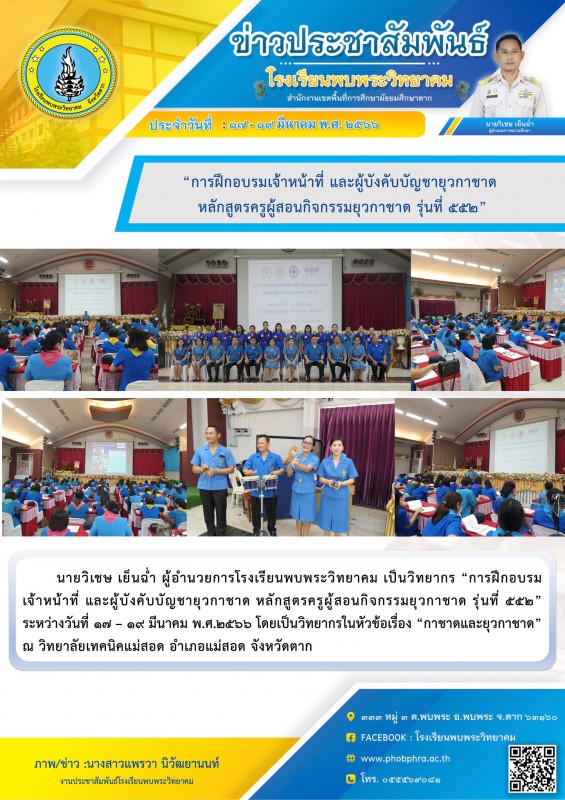 นายวิเชษ เย็นฉ่ำ ผู้อำนวยการโรงเรียนพบพระวิทยาคม เป็นวิทยากร “การฝึกอบรมเจ้าหน้าที่ และผู้บังคับบัญชายุวกาชาด หลักสูตรครูผู้สอนกิจกรรมยุวกาชาด รุ่นที่ ๕๕๒” ระหว่างวันที่ ๑๗ – ๑๙ มีนาคม พ.ศ.๒๕๖๖ โดยเป็นวิทยากรในหัวข้อเรื่อง “กาชาดและยุวกาชาด” ณ วิทยาลัยเทคนิคแม่สอด อำเภอแม่สอด จังหวัดตาก |