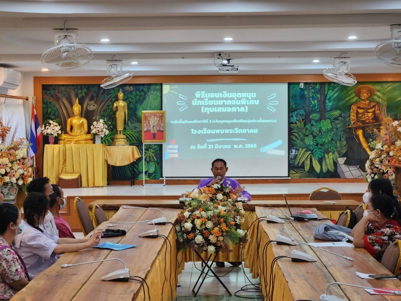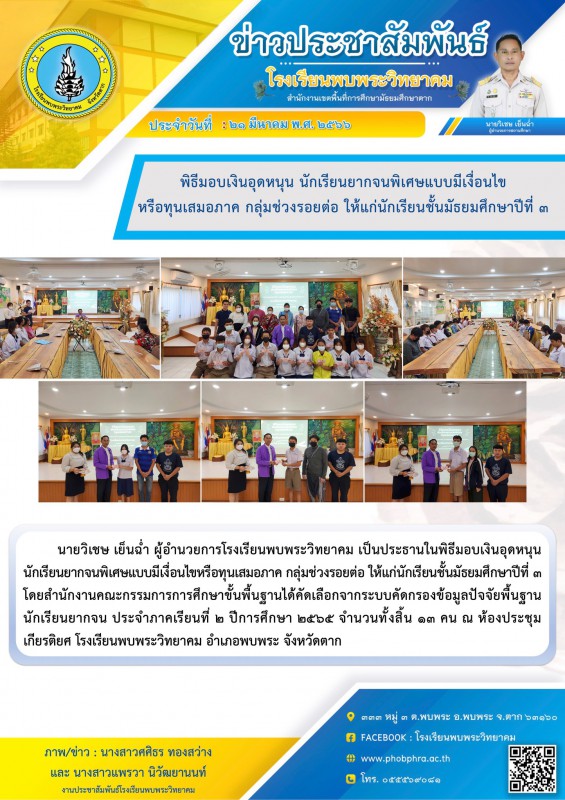 นายวิเชษ เย็นฉ่ำ ผู้อำนวยการโรงเรียนพบพระวิทยาคม เป็นประธานในพิธีมอบเงินอุดหนุน นักเรียนยากจนพิเศษแบบมีเงื่อนไขหรือทุนเสมอภาค กลุ่มช่วงรอยต่อ ให้แก่นักเรียนชั้นมัธยมศึกษาปีที่ ๓ โดยสำนักงานคณะกรรมการการศึกษาขั้นพื้นฐานได้คัดเลือกจากระบบคัดกรองข้อมูลปัจจัยพื้นฐานนักเรียนยากจน ประจำภาคเรียนที่ ๒ ปีการศึกษา ๒๕๖๕ จำนวนทั้งสิ้น ๑๓ คน ณ ห้องประชุมเกียรติยศ โรงเรียนพบพระวิทยาคม อำเภอพบพระ จังหวัดตาก |
