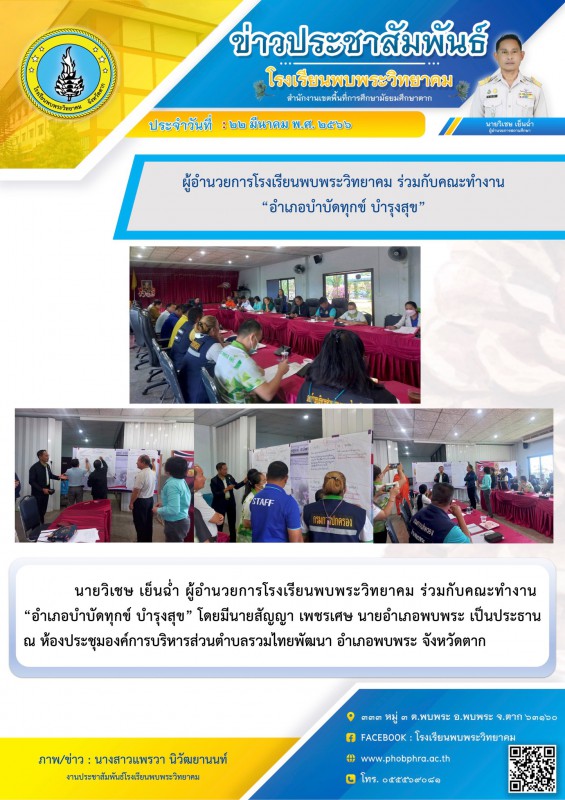 นายวิเชษ เย็นฉ่ำ ผู้อำนวยการโรงเรียนพบพระวิทยาคม ร่วมกับคณะทำงาน “อำเภอบำบัดทุกข์ บำรุงสุข” โดยมีนายสัญญา เพชรเศษ นายอำเภอพบพระ เป็นประธาน ณ ห้องประชุมองค์การบริหารส่วนตำบลรวมไทยพัฒนา อำเภอพบพระ จังหวัดตาก |