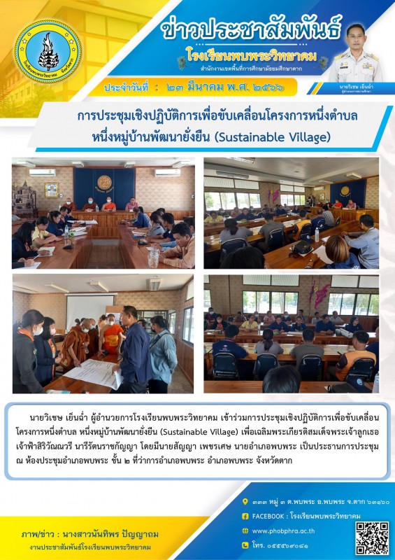 นายวิเชษ เย็นฉ่ำ ผู้อำนวยการโรงเรียนพบพระวิทยาคม เข้าร่วมการประชุมเชิงปฏิบัติการเพื่อขับเคลื่อนโครงการหนึ่งตำบล หนึ่งหมู่บ้านพัฒนายั่งยืน (Sustainable Village) เพื่อเฉลิมพระเกียรติสมเด็จพระเจ้าลูกเธอเจ้าฟ้าสิริวัณณวรี นารีรัตนราชกัญญา โดยมีนายสัญญา เพชรเศษ นายอำเภอพบพระ เป็นประธานการประชุม ณ ห้องประชุมอำเภอพบพระ ชั้น 2 ที่ว่าการอำเภอพบพระ อำเภอพบพระ จังหวัดตาก |