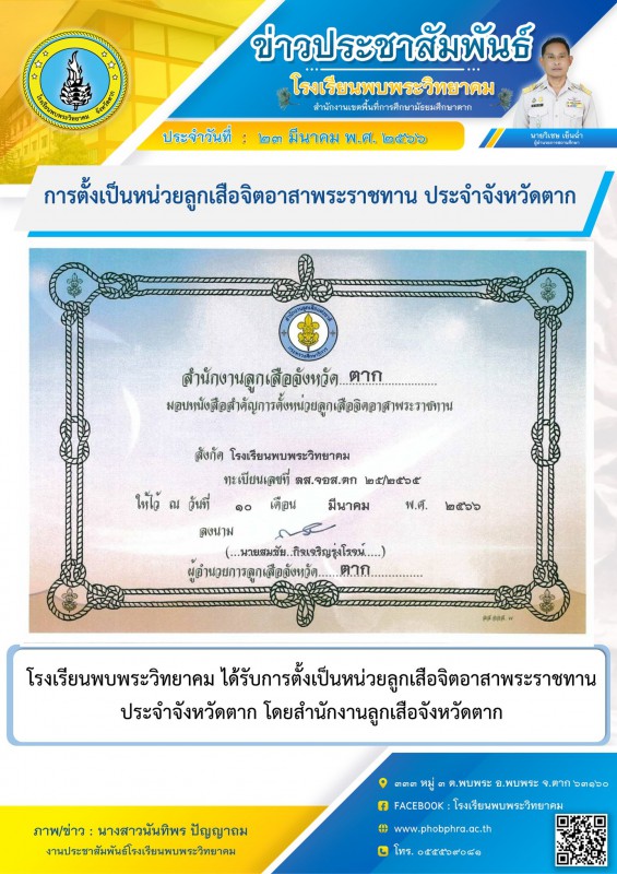 โรงเรียนพบพระวิทยาคม ได้รับการตั้งเป็นหน่วยลูกเสือจิตอาสาพระราชทาน ประจำจังหวัดตาก โดยสำนักงานลูกเสือจังหวัดตาก