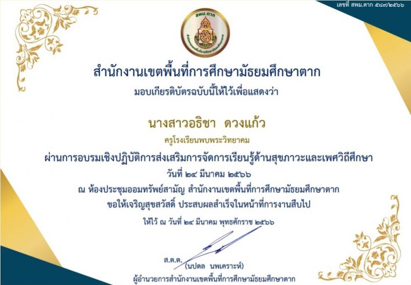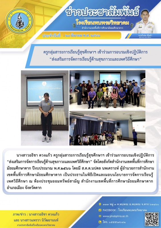 นางสาวอธิชา ดวงแก้ว ครูกลุ่มสาระการเรียนรู้สุขศึกษาฯ เข้าร่วมการอบรมเชิงปฏิบัติการ “ส่งเสริมการจัดการเรียนรู้ด้านสุขภาวะและเพศวิถีศึกษา” จัดโดยสังกัดสำนักงานเขตพื้นที่การศึกษามัธยมศึกษาตาก ปีงบประมาณ พ.ศ.๒๕๖๖ โดยมี ส.ต.ต.นปดล นพเคราะห์ ผู้อำนวยการสำนักงานเขตพื้นที่การศึกษามัธยมศึกษาตาก เป็นประธานในพิธีเปิดและมอบนโยบายการจัดการเรียนรู้ เพศวิถีศึกษา ณ ห้องประชุมออมทรัพย์สามัญ สำนักงานเขตพื้นที่การศึกษามัธยมศึกษาตาก อำเภอเมือง จังหวัดตาก |