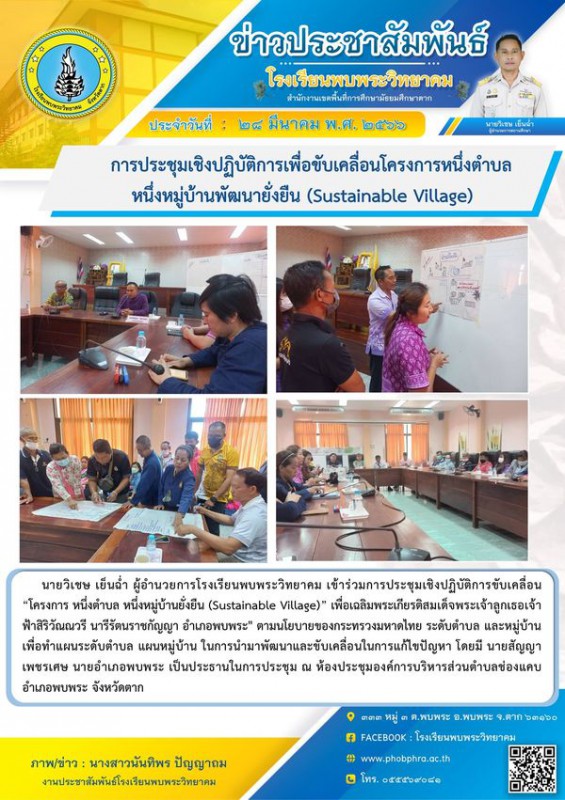 นายวิเชษ เย็นฉ่ำ ผู้อำนวยการโรงเรียนพบพระวิทยาคม เข้าร่วมการประชุมเชิงปฏิบัติการขับเคลื่อน “โครงการ หนึ่งตำบล หนึ่งหมู่บ้านยั่งยืน (Sustainable Village)” เพื่อเฉลิมพระเกียรติสมเด็จพระเจ้าลูกเธอเจ้าฟ้าสิริวัณณวรี นารีรัตนราชกัญญา อำเภอพบพระ" ตามนโยบายของกระทรวงมหาดไทย ระดับตำบล และหมู่บ้าน เพื่อทำแผนระดับตำบล แผนหมู่บ้าน ในการนำมาพัฒนาและขับเคลื่อนในการแก้ไขปัญหา โดยมี นายสัญญา เพชรเศษ นายอำเภอพบพระ เป็นประธานในการประชุม ณ ห้องประชุมองค์การบริหารส่วนตำบลช่องแคบ อำเภอพบพระ จังหวัดตาก |