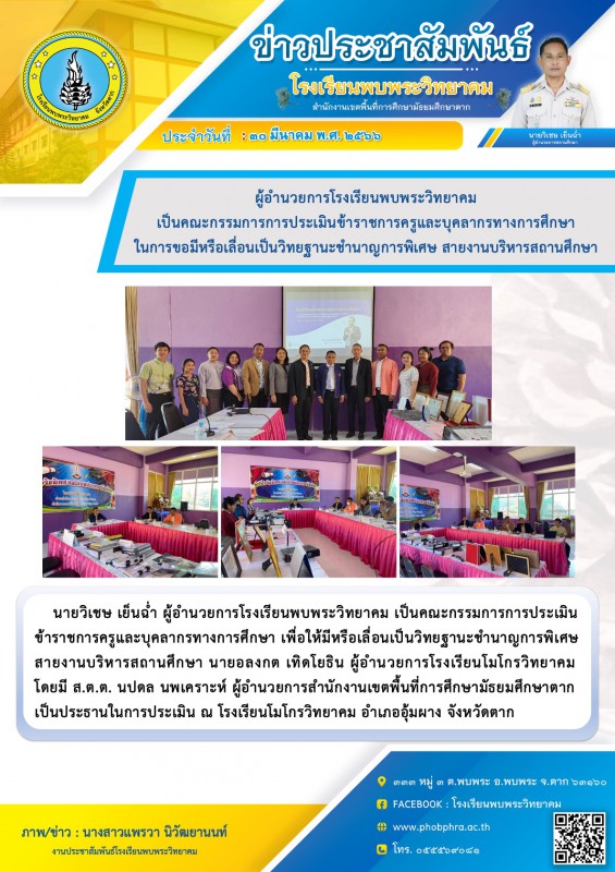 นายวิเชษ เย็นฉ่ำ ผู้อำนวยการโรงเรียนพบพระวิทยาคม เป็นคณะกรรมการการประเมินข้าราชการครูและบุคลากรทางการศึกษา เพื่อให้มีหรือเลื่อนเป็นวิทยฐานะชำนาญการพิเศษ สายงานบริหารสถานศึกษา นายอลงกต เทิดโยธิน ผู้อำนวยการโรงเรียนโมโกรวิทยาคม โดยมี ส.ต.ต. นปดล นพเคราะห์ ผู้อำนวยการสำนักงานเขตพื้นที่การศึกษามัธยมศึกษาตาก เป็นประธานในการประเมิน ณ โรงเรียนโมโกรวิทยาคม อำเภออุ้มผาง จังหวัดตาก |
