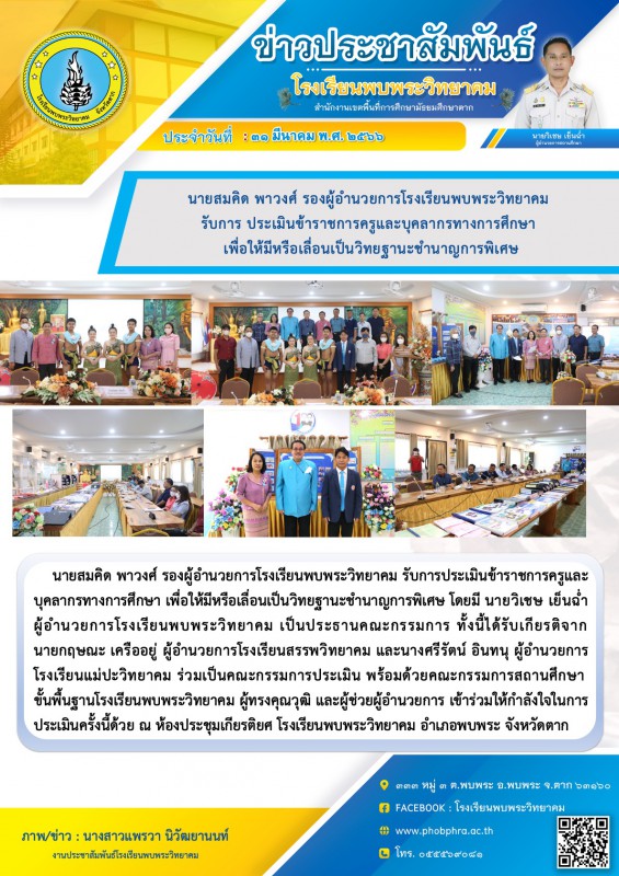 นายสมคิด พาวงศ์ รองผู้อำนวยการโรงเรียนพบพระวิทยาคม รับการประเมินข้าราชการครูและบุคลากรทางการศึกษา เพื่อให้มีหรือเลื่อนเป็นวิทยฐานะชำนาญการพิเศษ โดยมี นายวิเชษ เย็นฉ่ำ ผู้อำนวยการโรงเรียนพบพระวิทยาคม เป็นประธานคณะกรรมการ ทั้งนี้ได้รับเกียรติจาก นายกฤษณะ เครืออยู่ ผู้อำนวยการโรงเรียนสรรพวิทยาคม และนางศรีรัตน์ อินทนุ ผู้อำนวยการโรงเรียนแม่ปะวิทยาคม ร่วมเป็นคณะกรรมการประเมิน พร้อมด้วยคณะกรรมการสถานศึกษา ขั้นพื้นฐานโรงเรียนพบพระวิทยาคม ผู้ทรงคุณวุฒิ และผู้ช่วยผู้อำนวยการ เข้าร่วมให้กำลังใจในการประเมินครั้งนี้ด้วย ณ ห้องประชุมเกียรติยศ โรงเรียนพบพระวิทยาคม อำเภอพบพระ จังหวัดตาก |