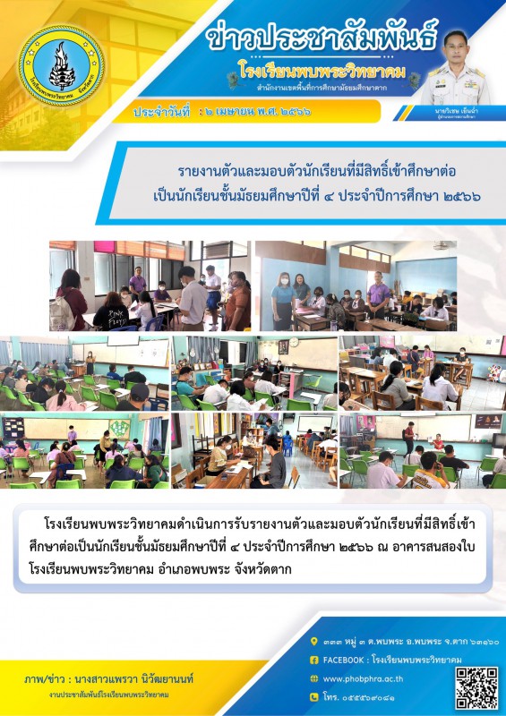 โรงเรียนพบพระวิทยาคมดำเนินการรับรายงานตัวและมอบตัวนักเรียนที่มีสิทธิ์เข้าศึกษาต่อเป็นนักเรียนชั้นมัธยมศึกษาปีที่ ๔ ประจำปีการศึกษา ๒๕๖๖ ณ อาคารสนสองใบโรงเรียนพบพระวิทยาคม อำเภอพบพระ จังหวัดตาก |