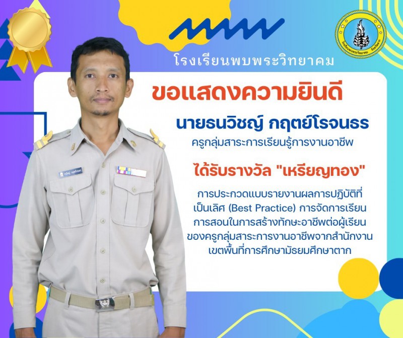นายธนวิชญ์ กฤตย์โรจนธร ครูกลุ่มสาระการเรียนรู้การงานอาชีพ ได้รับรางวัล "เหรียญทอง" การประกวดแบบรายงานผลการปฏิบัติที่เป็นเลิศ (Best Practice) การจัดการเรียนการสอนในการสร้างทักษะอาชีพต่อผู้เรียนของครูกลุ่มสาระการงานอาชีพจากสำนักงานเขตพื้นที่การศึกษามัธยมศึกษาตาก |