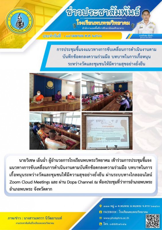 นายวิเชษ เย็นฉ่ำ ผู้อำนวยการโรงเรียนพบพระวิทยาคม เข้าร่วมการประชุมชี้แจง แนวทางการขับเคลื่อนการดำเนินงานตามบันทึกข้อตกลงความร่วมมือ บทบาทในการเกื้อหนุนระหว่างวัดและชุมชนให้มีความสุขอย่างยั่งยืน ผ่านระบบทางไกลออนไลน์ Zoom Cloud Meetings และ ผ่าน Dopa Channel ณ ห้องประชุมที่ว่าการอำเภอพบพระ อำเภอพบพระ จังหวัดตาก |