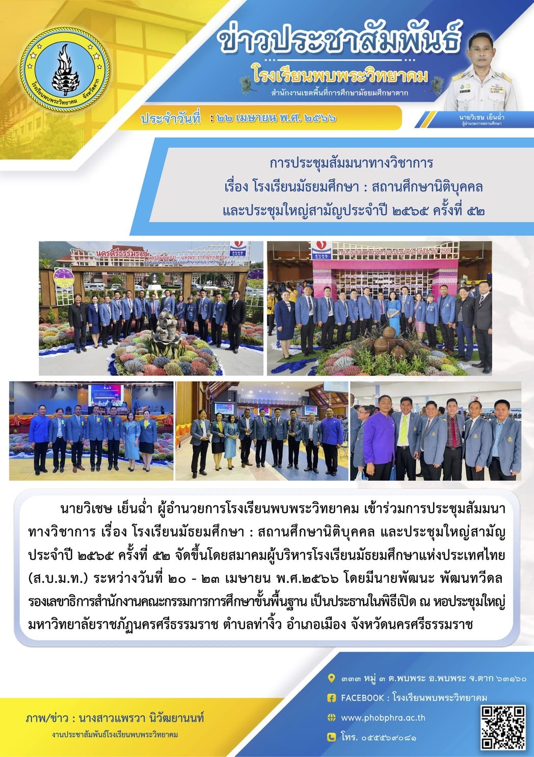 นายวิเชษ เย็นฉ่ำ ผู้อำนวยการโรงเรียนพบพระวิทยาคม เข้าร่วมการประชุมสัมมนาทางวิชาการ เรื่อง โรงเรียนมัธยมศึกษา : สถานศึกษานิติบุคคล และประชุมใหญ่สัมมนาประจำปี 2565 ครั้งที่ 52 จัดขึ้นโดยสมาคมผู้บริหารโรงเรียนมัธยมศึกษาแห่งประเทศไทย (ส.บ.ม.ท.) ระหว่างวันที่ 20 - 23 เมษายน พ.ศ.2566 โดยมีนายพัฒนะ พัฒนทวีดล รองเลขาธิการสำนักงานคณะกรรมการการศึกษาขั้นพื้นฐาน เป็นประธานในพิธีเปิด ณ หอประชุมใหญ่มหาวิทยาลัยราชภัฏนครศรีธรรมราช ตำบลท่างิ้ว อำเภอเมือง จังหวัดนครศรีธรรมราช |