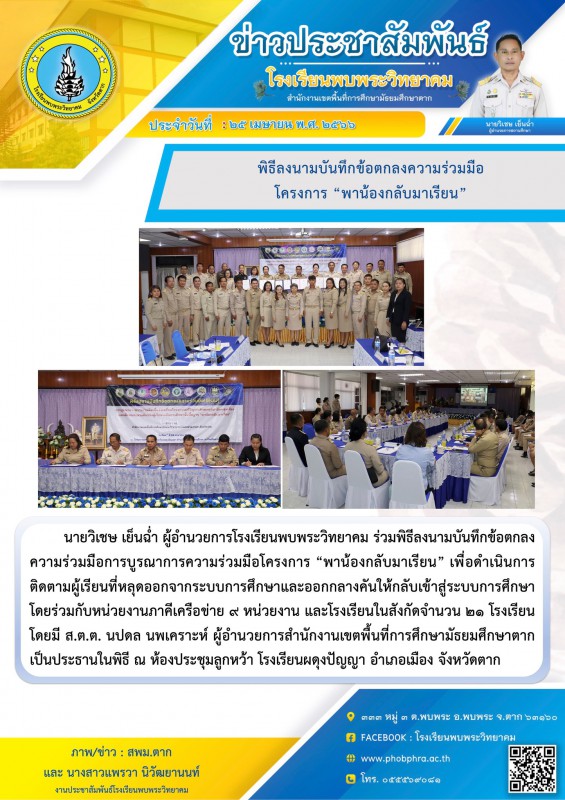 นายวิเชษ เย็นฉ่ำ ผู้อำนวยการโรงเรียนพบพระวิทยาคม ร่วมพิธีลงนามบันทึกข้อตกลงความร่วมมือการบูรณาการความร่วมมือโครงการ “พาน้องกลับมาเรียน” เพื่อดำเนินการติดตามผู้เรียนที่หลุดออกจากระบบการศึกษาและออกกลางคันให้กลับเข้าสู่ระบบการศึกษา โดยร่วมกับหน่วยงานภาคีเครือข่าย ๙ หน่วยงาน และโรงเรียนในสังกัดจำนวน ๒๑ โรงเรียนโดยมี ส.ต.ต. นปดล นพเคราะห์ ผู้อำนวยการสำนักงานเขตพื้นที่การศึกษามัธยมศึกษาตาก เป็นประธานในพิธี ณ ห้องประชุมลูกหว้า โรงเรียนผดุงปัญญา อำเภอเมือง จังหวัดตาก |