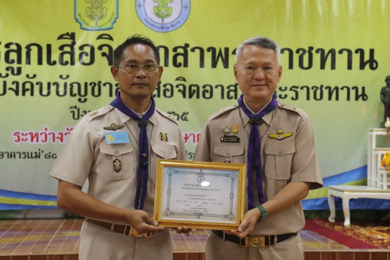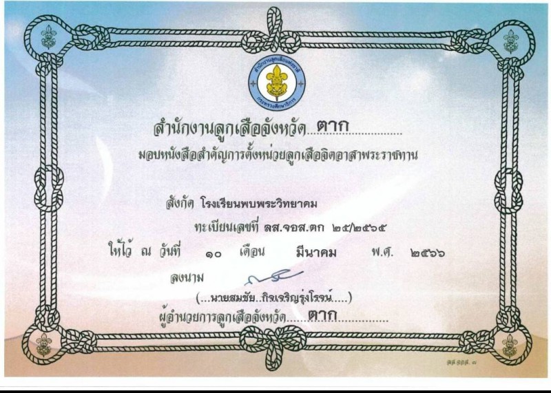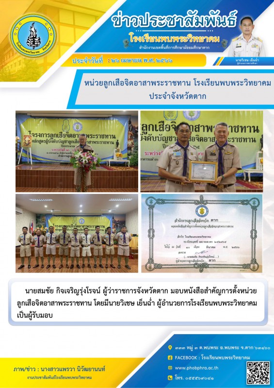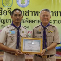 นายสมชัย กิจเจริญรุ่งโรจน์ ผู้ว่าราชการจังหวัดตาก มอบหนังสือสำคัญการตั้งหน่วยลูกเสือจิตอาสาพระราชทาน โดยมีนายวิเชษ เย็นฉ่ำ ผู้อำนวยการโรงเรียนพบพระวิทยาคมเป็นผู้รับมอบ |