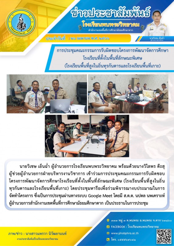 นายวิเชษ เย็นฉ่ำ ผู้อำนวยการโรงเรียนพบพระวิทยาคม พร้อมด้วยนางวิไลพร ต๊ะสุ ผู้ช่วยผู้อำนวยการฝ่ายบริหารงานวิชาการ เข้าร่วมการประชุมคณะกรรมการรับผิดชอบโครงการพัฒนาจัดการศึกษาโรงเรียนที่ตั้งในพื้นที่ลักษณะพิเศษ (โรงเรียนพื้นที่สูงในถิ่นทุรกันดารและโรงเรียนพื้นที่เกาะ) โดยประชุมหารือเพื่อร่วมพิจารณางบประมาณในการจัดทำโครงการ ซึ่งเป็นการประชุมผ่านทางระบบ Google Meet โดยมี ส.ต.ต. นปดล นพเคราะห์ ผู้อำนวยการสำนักงานเขตพื้นที่การศึกษามัธยมศึกษาตาก เป็นประธานในการประชุม |