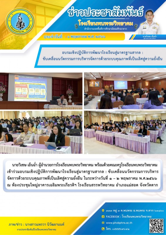 นายวิเชษ เย็นฉ่ำ ผู้อำนวยการโรงเรียนพบพระวิทยาคม พร้อมด้วยคณะครูโรงเรียนพบพระวิทยาคม เข้าร่วมอบรมเชิงปฏิบัติการพัฒนาโรงเรียนสู่มาตรฐานสากล : ขับเคลื่อนนวัตกรรมการบริหารจัดการด้วยระบบคุณภาพที่เป็นเลิศสู่ความยั่งยืน ในระหว่างวันที่ ๑ – ๒ พฤษภาคม พ.ศ.๒๕๖๖ ณ ห้องประชุมใหญ่อาคารเฉลิมพระเกียรติฯ โรงเรียนสรรพวิทยาคม อำเภอแม่สอด จังหวัดตาก |