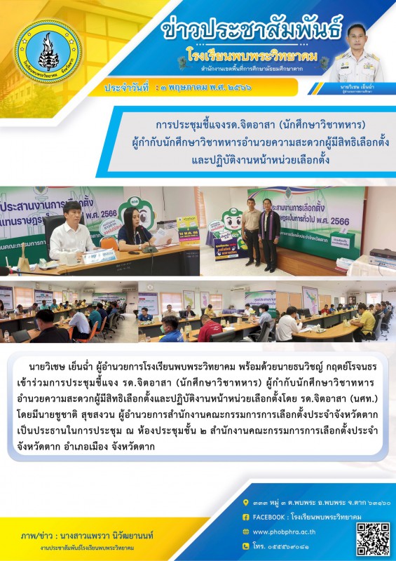 นายวิเชษ เย็นฉ่ำ ผู้อำนวยการโรงเรียนพบพระวิทยาคม พร้อมด้วยนายธนวิชญ์ กฤตย์โรจนธร เข้าร่วมการประชุมชี้แจง รด.จิตอาสา (นักศึกษาวิชาทหาร) ผู้กำกับนักศึกษาวิชาทหาร อำนวยความสะดวกผู้มีสิทธิเลือกตั้งและปฏิบัติงานหน้าหน่วยเลือกตั้งโดย รด.จิตอาสา (นศท.) โดยมีนายชูชาติ สุขสงวน ผู้อำนวยการสำนักงานคณะกรรมการการเลือกตั้งประจำจังหวัดตาก เป็นประธานในการประชุม ณ ห้องประชุมชั้น ๒ สำนักงานคณะกรรมการการเลือกตั้งประจำจังหวัดตาก อำเภอเมือง จังหวัดตาก |