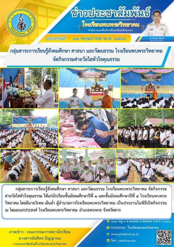 กลุ่มสาระการเรียนรู้สังคมศึกษา ศาสนา และวัฒนธรรม โรงเรียนพบพระวิทยาคม จัดกิจกรรมค่ายวัยใสหัวใจคุณธรรม ให้แก่นักเรียนชั้นมัธยมศึกษาปีที่ 1 และชั้นมัธยมศึกษาปีที่ 4 โรงเรียนพบพระวิทยาคม โดยมีนายวิเชษ เย็นฉ่ำ ผู้อำนวยการโรงเรียนพบพระวิทยาคม เป็นประธานในพิธีเปิดกิจกรรม ณ โดมอเนกประสงค์ โรงเรียนพบพระวิทยาคม อำเภอพบพระ จังหวัดตาก |