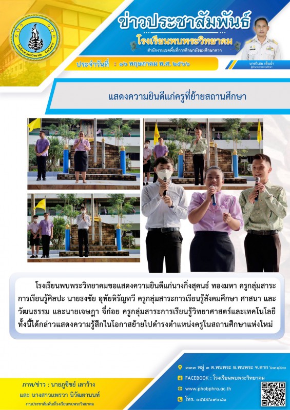 โรงเรียนพบพระวิทยาคมขอแสดงความยินดีแก่นางกิ่งสุคนธ์ ทองมหา ครูกลุ่มสาระการเรียนรู้ศิลปะ นายธงชัย อุทัยหิรัญทวี ครูกลุ่มสาระการเรียนรู้สังคมศึกษา ศาสนา และวัฒนธรรม และนายเจษฎา จี๋ก๋อย ครูกลุ่มสาระการเรียนรู้วิทยาศาสตร์และเทคโนโลยี ทั้งนี้ได้กล่าวแสดงความรู้สึกในโอกาสย้ายไปดำรงตำแหน่งครูในสถานศึกษาแห่งใหม่