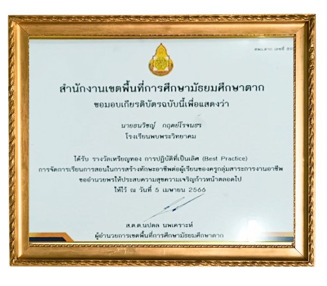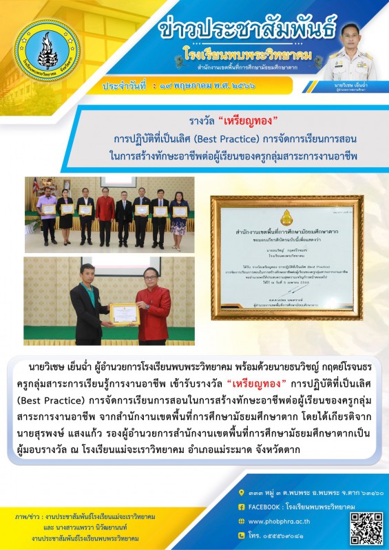 นายวิเชษ เย็นฉ่ำ ผู้อำนวยการโรงเรียนพบพระวิทยาคม พร้อมด้วยนายธนวิชญ์ กฤตย์โรจนธร ครูกลุ่มสาระการเรียนรู้การงานอาชีพ เข้ารับรางวัล “เหรียญทอง” การปฏิบัติที่เป็นเลิศ (Best Practice) การจัดการเรียนการสอนในการสร้างทักษะอาชีพต่อผู้เรียนของครูกลุ่มสาระการงานอาชีพ จากสำนักงานเขตพื้นที่การศึกษามัธยมศึกษาตาก โดยได้เกียรติจากนายสุรพงษ์ แสงแก้ว รองผู้อำนวยการสำนักงานเขตพื้นที่การศึกษามัธยมศึกษาตากเป็น ผู้มอบรางวัล ณ โรงเรียนแม่จะเราวิทยาคม อำเภอแม่ระมาด จังหวัดตาก |