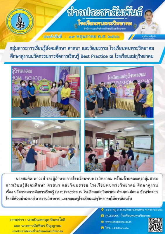 นายสมคิด พาวงศ์ รองผู้อำนวยการโรงเรียนพบพระวิทยาคม พร้อมด้วยคณะครูกลุ่มสาระการเรียนรู้สังคมศึกษา ศาสนา และวัฒนธรรม โรงเรียนพบพระวิทยาคม ศึกษาดูงาน เรื่อง นวัตกรรมการจัดการเรียนรู้ Best Practice ณ โรงเรียนแม่กุวิทยาคม อำเภอแม่สอด จังหวัดตาก โดยมีหัวหน้าฝ่ายบริหารงานวิชาการ และคณะครูโรงเรียนแม่กุวิทยาคมให้การต้อนรับ |