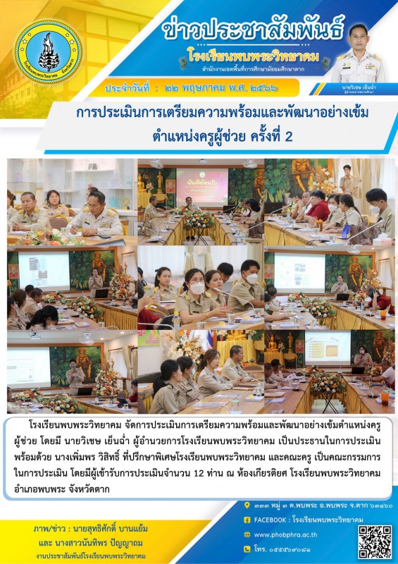 โรงเรียนพบพระวิทยาคม จัดการประเมินการเตรียมความพร้อมและพัฒนาอย่างเข้มตำแหน่งครูผู้ช่วย โดยมี นายวิเชษ เย็นฉ่ำ ผู้อำนวยการโรงเรียนพบพระวิทยาคม เป็นประธานในการประเมินพร้อมด้วย นางเพิ่มพร วิสิทธิ์ ที่ปรึกษาพิเศษโรงเรียนพบพระวิทยาคม และคณะครู เป็นคณะกรรมการในการประเมิน โดยมีผู้เข้ารับการประเมินจำนวน 12 ท่าน ณ ห้องเกียรติยศ โรงเรียนพบพระวิทยาคม อำเภอพบพระ จังหวัดตาก |