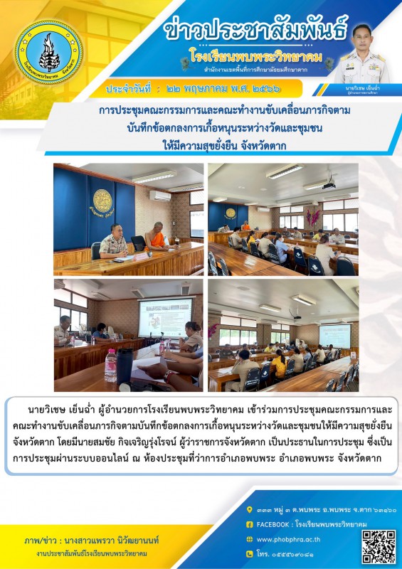 นายวิเชษ เย็นฉ่ำ ผู้อำนวยการโรงเรียนพบพระวิทยาคม เข้าร่วมการประชุมคณะกรรมการและคณะทำงานขับเคลื่อนภารกิจตามบันทึกข้อตกลงการเกื้อหนุนระหว่างวัดและชุมชนให้มีความสุขยั่งยืน จังหวัดตาก โดยมีนายสมชัย กิจเจริญรุ่งโรจน์ ผู้ว่าราชการจังหวัดตาก เป็นประธานในการประชุม ซึ่งเป็นการประชุมผ่านระบบออนไลน์ ณ ห้องประชุมที่ว่าการอำเภอพบพระ อำเภอพบพระ จังหวัดตาก |