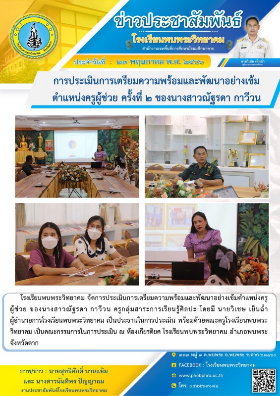 โรงเรียนพบพระวิทยาคม จัดการประเมินการเตรียมความพร้อมและพัฒนาอย่างเข้มตำแหน่งครูผู้ช่วย ของนางสาวณัฐรดา กาวีวน ครูกลุ่มสาระการเรียนรู้ศิลปะ โดยมี นายวิเชษ เย็นฉ่ำ ผู้อำนวยการโรงเรียนพบพระวิทยาคม เป็นประธานในการประเมิน พร้อมด้วยคณะครูโรงเรียนพบพระวิทยาคม เป็นคณะกรรมการในการประเมิน ณ ห้องเกียรติยศ โรงเรียนพบพระวิทยาคม อำเภอพบพระ จังหวัดตาก |